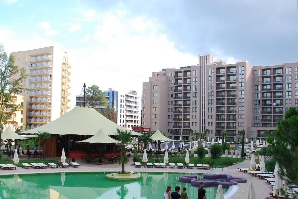 Вернулись из Болгарии вчера, отдыхала с ребёнком 4 лет, и племянницей с ребёнком 3,8 года, как написано было на нашем пакете документов - наш эксперт по отдыху - TUI, то есть его представитель встретил нас в аэропорту и проводил до автобуса, чемоданы двум женщинам с маленькими детьми положить в багажное отделение никто не помог, водитель смотрел на нас и говорил по телефону, ехали до отеля недолго, но высадили нас через дорогу от входа в отель, объяснив это тем, что автобус не может подъехать к входу (хотя потом мы каждый день наблюдали и высадку и посадку у дверей отеля, да и забирали нас из отеля уже от дверей, на таком же большом автобусе) - это про радушие и гостеприимство... Заселили в номер быстро, сам номер - двухкомнатные апартаменты в общем то хороший, только обещанных халатов и тапочек нет, убирались плохо, о чем свидетельствовал песок и мусор на ковролине, пыль на тумбочках. Полотенца меняли во время, на ночь, видимо выключалась вентиляция и к утру в санузле пахло канализацией. Обещанного парка вокруг отеля не нашли, его вообще нет, до пляжа, конечно не 70 метров, идти через дорогу, через череду кафешек и магазинов, минут 10 минимум... первая линия пляжа, (она отделена верёвочкой) платная, один шезлонг 7 левов, зонт ещё 7 левов, за верёвочкой, на бесплатном пляже валом лежат люди на полотенцах, через которых надо лавировать, чтобы дойти по моря. На платном пляже хоть и собирают мусор всё равно много окурков, в общем песок не золотой...Купаться можно было только утром, пока ещё не очень много народа, позже просыпалась подгулявшая накануне молодёжь и компаниями с пивом погружались по пояс в воду, шумели, смеялись, играли в мяч, надо заметить, что туалет на две кабинки на пляже платный 0,5 лева и очереди к нему никогда не было, так, что домысливайте сами...Очень грязно по дороге от моря до отеля, хотя служащие нашего отеля каждое утро убирались вдоль ограждения, только на долго не хватало.