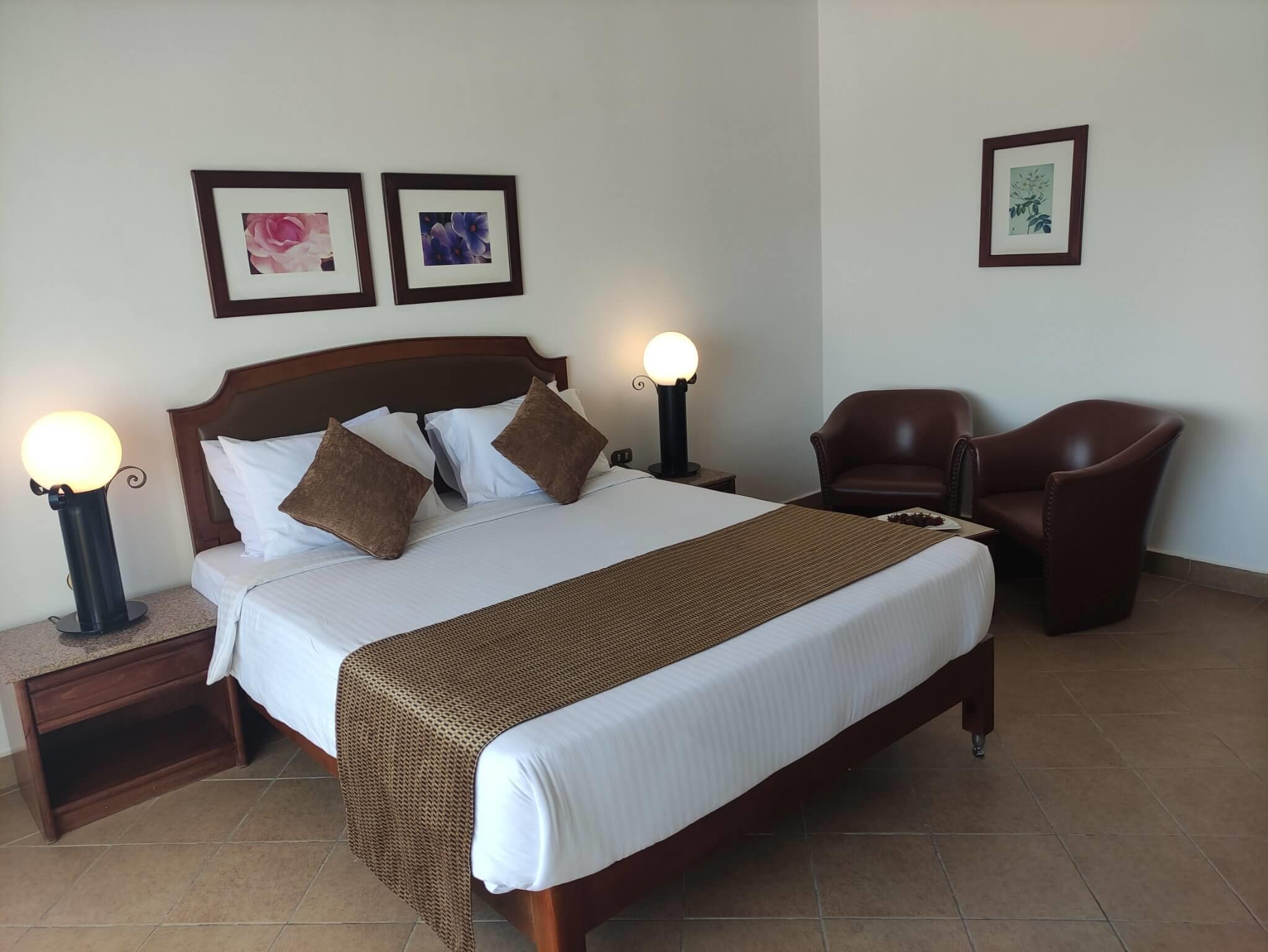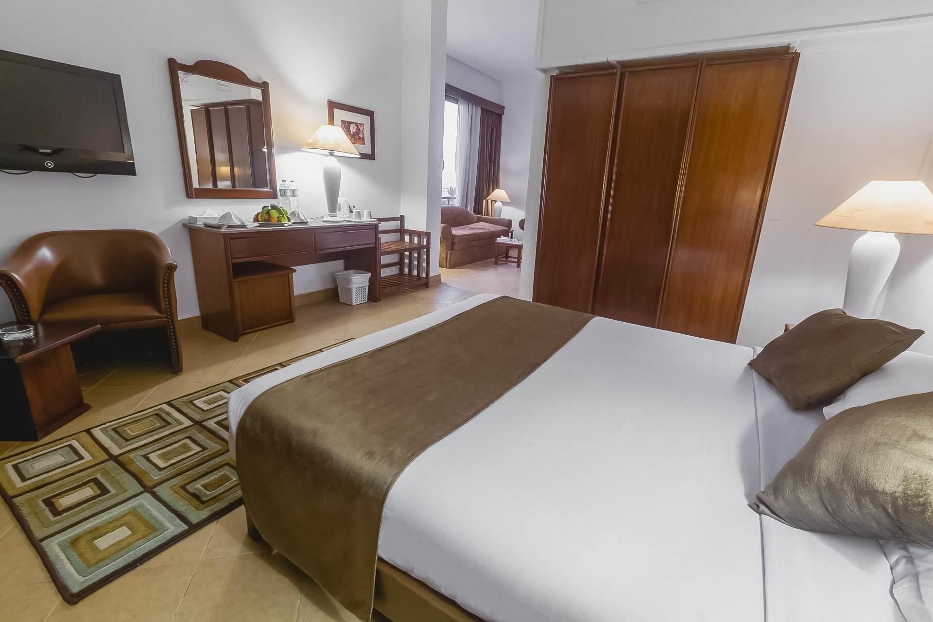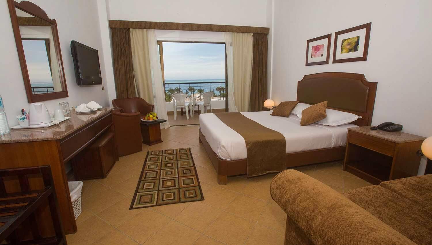 Отель выбрали по соотношению цена-качество+ отзывы на сайтах в интернете. И не ошиблись! Отель соответствует своим 4-м звездам. Заселение (конкретно у нас) произошло без проблем. Приехали в 9 часов утра, заезд был большой. Удалось в первых рядах попасть к менеджеру на ресепшене. Сначала дали ключи от номера в бунгало (корпус А). Когда посмотрели номер- не понравилось-((( Во-первых, не было балкона, а во-вторых, вид из окна - на ресторан и кухню. Это значит- никакого покоя ни вечером, ни ночью. Пришлось возвращаться к менеджеру, вспоминать пару-тройку арабских слов,улыбнуться, и- УРА-))) Ключи от номера в главном корпусе были у нас! Этот номер вполне соответствовал звездности отеля. Мебель- обычная, не новая, но вполне... Сантехника тоже на уровне, ни разу ничего не ломалось. Правда, бывали перебои с горячей водой, но это в основном во время массового возвращения народа с пляжа. Вид из окна был на известнейшую в Хургаде Мамшу. В этом были свои минусы и плюсы. Минус- это место променада местного населения. А поскольку этот период выпадал на Пасху, то массовые шумные гуляния не прекращались ни днем, ни особенно ночью. Шумновато, конечно, и возникал вопрос- когда же спят их дети? Причем, "танцевали все"-))) И не только местные христиане- копты, но и мусульмане. Может, у них в это время тоже был какой-то праздник? Плюсы- все остальное! Недалеко от отеля расположен знаменитый клуб Little Bidda. Много лавочек, магазинчиков и больших магазинов, где торгуют всем и вся-))) Есть магазины в фиксированными ценами, Там не поторгуешься! А вот в небольших магазинчиках и лавочках- вид спорта под названием "давайте поторгуемся" развлекает всех- и продавца и покупателя. Надо только помнить, что если вы не планируете покупать товар - лучше торг и не начинать.