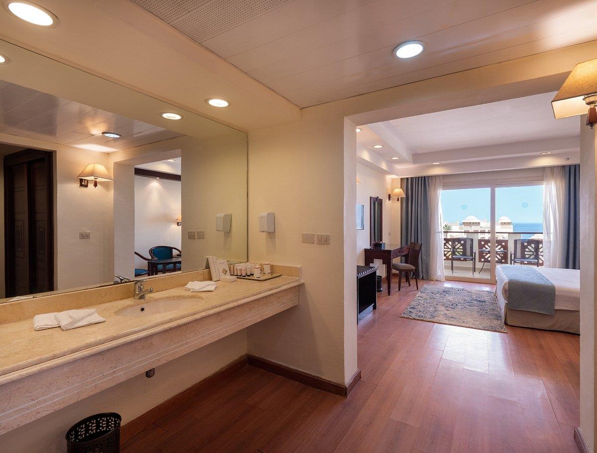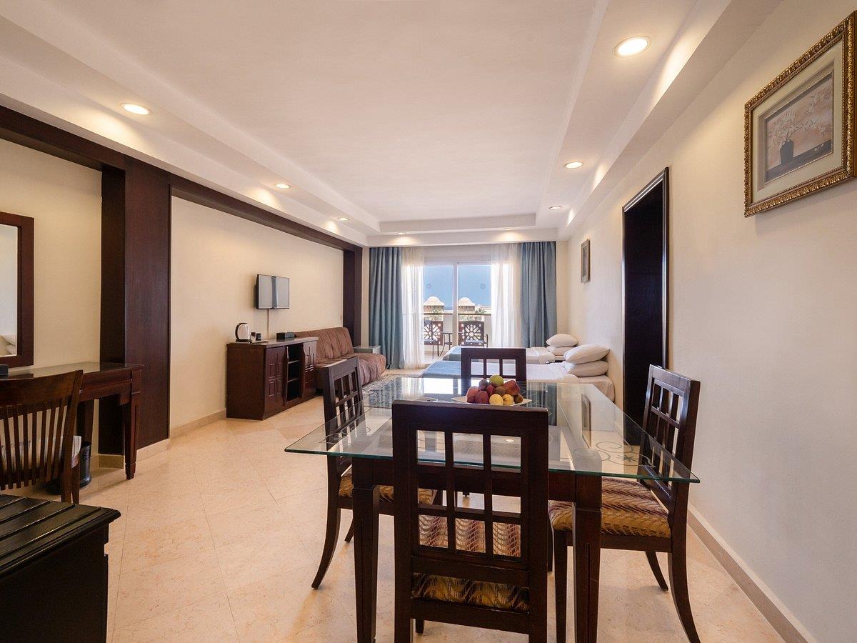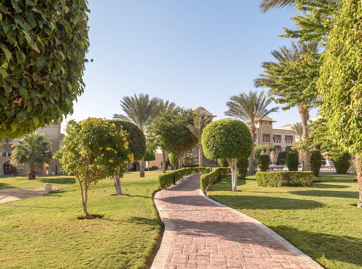 Отель выбирали по соотношению размера территории и количества отдыхающих.Интересовал хороший сервис,спортивный досуг.Территория большая, все очень зелено,цветет. Красиво.Заселили быстро.Номер хороший,большой, достаточно комфортный,все устроило.О сервисе:если чего-то не хватает или поломалось,ходить на ресепшн надо неоднократно.Или дать "бакшиш".В ресторане - очереди за едой и напитками (норма - 2 стакана в одни руки,но за пару баксов будут наливать много порций).Еды много,без изысков,но голодными не останетесь.При системе "все включено" фактически 3-разовое питание, если не успел поесть до 21:30,жди завтрака.Дискотека в тесном прокуренном помещении,унылая,тоже для выкачивания денег (5 баксов заказ).Аниматоры на пляже работают неплохо,старательно.В общем, по "звездности" явно не 5, с большой натяжкой 4 -за счет красивых обитателей моря. :-)