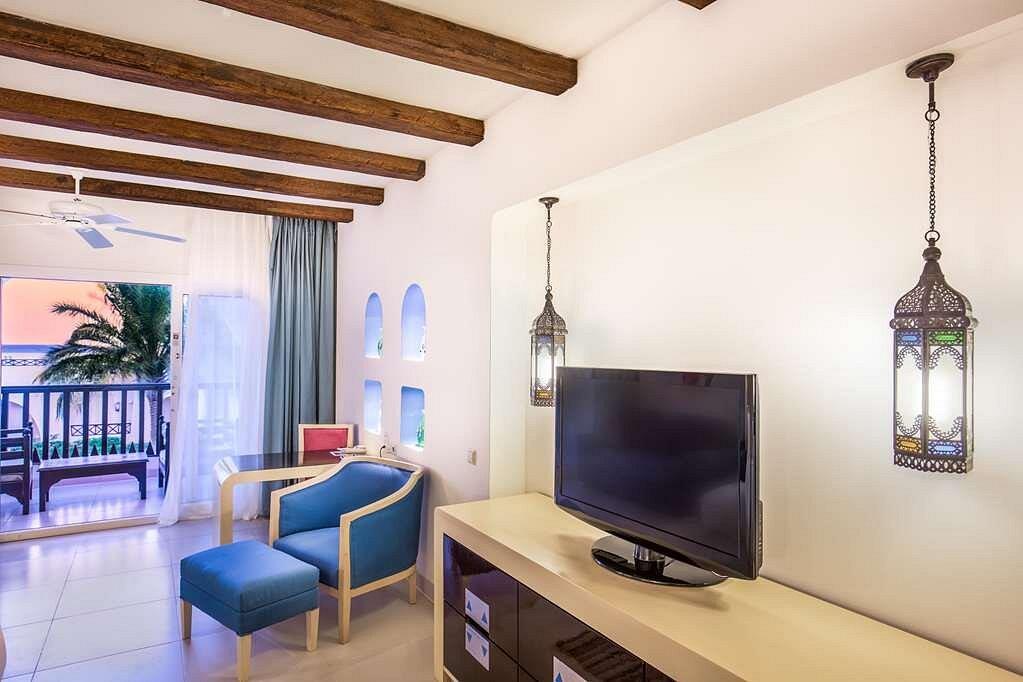 Недостатки: не стоит брать номер с видом на море, так как с уровня 2го этажа виднеется в 500 метрах узкая полоска моря. Поэтому считаем, что достаточно взять номер с видом на бассейн. До моря достаточно далеко, но по территории отеля ездит каждые 5 минут паровозик, доставляющий к морю. Пляж оборудован хорошими зонтиками и лежаками, но непосредственный вход в море запрещен, так как там находятся кораллы, для входа в воду и сноркелинга необходимо пройти по пляжу вправо метров 200-300.