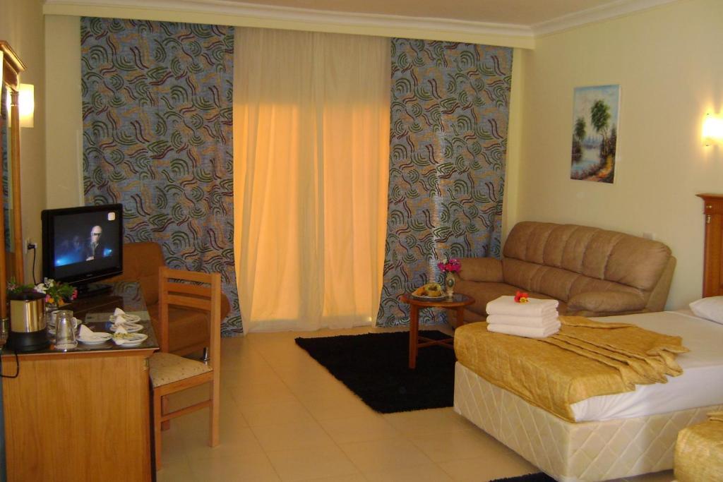приветливый, предложил нам сразу пойти позавтракать.После завтрака,подойдя к рецепшену,Ахмед нам сразу дал ключи и сказал,что номер для нас уже подготовлен.Так что с заселением у нас проблем не возникло.Поселили в хороший номер – просторный, чистый.Балкон большой с прекрасным видом на всю територию отеля и бассейн.Сама територия отеля не большая,но ухоженая.Каждое утро убирается,газоны и кустарники подстригаются.Бассейн замечательный – вода чистая,фильтра меняют в течении дня раз 5.Ночью проводят дезинфекцию,а на утро никакого запаха хлорки нет.Лежаки всегда были свободные,может потому что в это время отдыхающих было не слишком много.В основном очень много англичан,были и россияне,и поляки,и конечно украинцы.