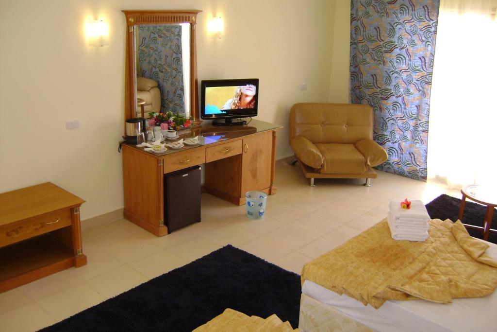 Заселили без проблем, номер большой как и все в этом отеле. Но грязно, убирают не каждый день. Когда мы заехали у нас ванна была вся жирная (в каком-то воске), пятна было невозможно отмыть. Вода кстати течет еле теплая. Постоянно все ломалось - сейф, фен, периодически не работал дверной замок. За любую починку персонал просил денег. Сотрудники, кстати, ОЧЕНЬ навязчивые, я третий раз в Египте но таких наглых еще не видела!