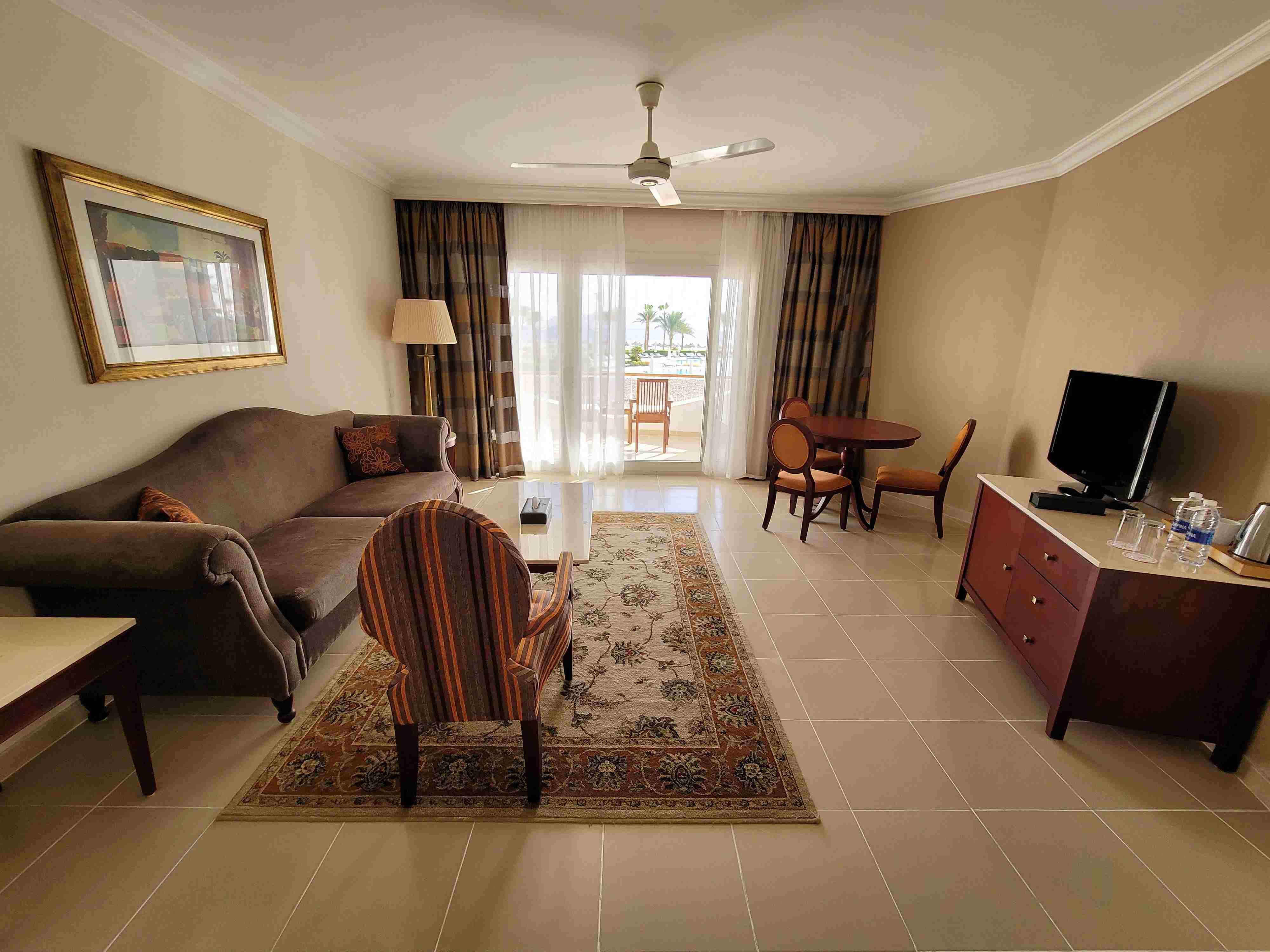 Отель дорогой, не оправдывает такую высокую цену. Еда однообразная, рыба одного вида каждый день, морепродукты были один раз: кальмары и креветки, десерты вечерние стояли утром с обветренной корочкой, из фруктов даже апельсин и мандарин не было, только бананы, яблоки и инжир. Импортных дорогих алкогольных напитков вообще нет, попросили мартини Бьянко - принесли какую-то вонючую кислятину желтого цвета, пошли разбираться и увидели разсверленное горлышко в бутылке из под мартини и туда залита какая-то гадость, коньяка вообще не было, и т.д. Туалет от бассейна, моря, ресторана за тридевять земель. Бара в бассейне нет. За вид "на море" при пустом отеле доплатить 50$ в сутки, чтоб пополнить мини бар нужно было бегать за обслугой. Один плюс - чисто, но это не стоит 3000$.