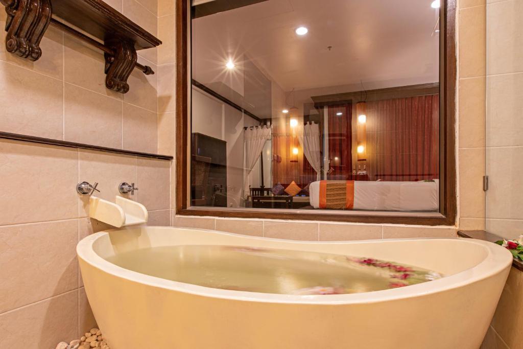 Первое впечатления, очень душно, первые три дня потом привыкаешь (акклиматизация). Отель произвел неизгладимые впечатления. Весь отель выполнен в восточном стиле (драконы, слоны и т.д),и тянет не 3+ а на 4+,хоть он и находится на 2-ой береговой линии. Номер в отели предоставили быстро, я не успел выпить чашку прохладного чая, любезно предоставленного персоналом отеля (10 минут). Зайдя в свой номер мне с первого раза все понравилось , дал 1$ на чаевые, таец обрадовался и ушел. Будьте внимательны со своими паспортами, на ресепшене при оформлении перепутали паспорта (у меня оказался в руках чужой паспорт гражданки РФ)я заметил, и эту создавшуюся ситуацию решили в течении 10 минут, с улыбкой на лице мне вернули мой паспорт. Вся территория отеля зеленая, самый настоящий тропический сад (пальмы, разнообразные кустарники). Окна из моего номера выходили на бассейн (вообще в этом отеле все номера, выходя вовнутрь) так что не партись при выборе. Все номера соответствуют (как на фотографиях у тур оператора), все чисто и аккуратно. Сантехника в норме. В мою путевку входило вкл.питание, и я пошел на ресепшен со своими талончиками (браслетов на руку не предусмотрено) спросить где я могу по ужинать и здесь я столкнулся с языковым барьером (так называемый,тай-инглиш) девушка работающая меня любезно проводила до ресторана который находится на территории отеля.В ресторанах отеля русского меню нету. Все меню на английском(картинок нет)В общем заказал себе Фигню (очень острое),пришлось дополнительно заказывать стакан молока (как оказалось позже все напитки платные, пришлось платить 50 бат на наши 50 руб.)При вкл.питании бесплатно чай, кофе, юпи. Все остальное, в том числе алкоголь платно (дорого).
