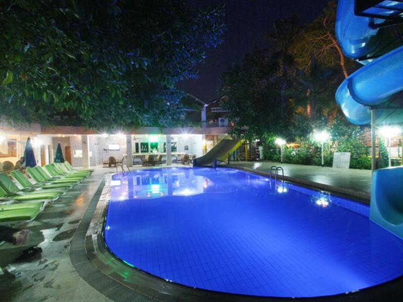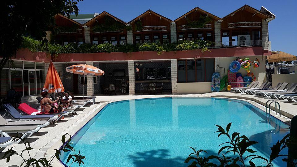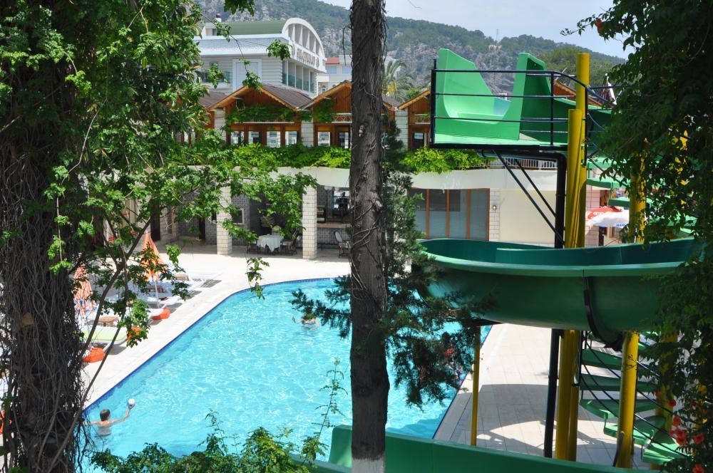 Буквально вчера вернулись с женой из Кемера. Скажу как есть. Територия отеля очень не плохая! Много зелени и укромных мест для "посидеть". В отеле три корпуса, два бассейна (один с горкой работающей по часам), два бара (один платный), турецкая баня хамам (ходить при отеле не рекомендую, есть подешевле), столы для приема пищи находятся на свежем воздухе (в тени).
