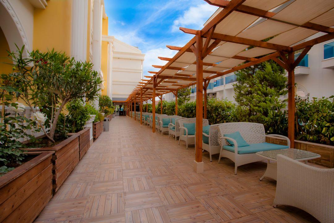 Приехали в Турцию не читав отзывов так как отель свежий и работал 4 месяца. Ехали с Киева с анекс туром . Скажу сразу - анекс тур полная жопа , больше с ними никогда не свяжусь. Трансфер в сиде состоялся нормально. Прибыли в 8 утра пошли на завтрак. Завтраки как всегда слабенькие. Заселили нас в 10 30 , ЧЕМ ПРИЯТНО УДИВИЛИ. Отель новый но сделано все тяп ляп, в ванной в номере поклеены обои как и в туалетах в отеле. Сразу скажу что главный минус отеля - ПРОСТО ОТСУТСТВИЕ ТЕРРИТОРИИ!! ее просто нет. А второе - это 3я (не вторая как пишут ) линия от моря... конечно автобус возил каждые 15 минут но для пятерки заявленного уровня это не то...Питание на обед и на ужин просто превосходное... Было все мясо рыба раки овощи фрукты бесплатное шампанское мороженное, короче отель немецкий и этим все сказано.Анимация суперская , украшения различные шоу, вообще огромное спасибо комманде аниматоров за их тяжелый труд... Особенно Марине из Украины за то что не оставляла нас славян не на секунду , возила на дискотеки и постоянно помогала в любой проблеме...В отеле есть гид от анекс тура - Самир - короче такого вруна я еще не видел, он нас так прокидал что это что то с чем то.... Отправил друзей на турецкую баню(они были в первый раз ) которая длилась 50 минут без пиллинга и пены , намазали олией и выпроводили. На рафтинг говорил что ехать 25 минут , за 2 часа еле доехали, температура воды в горной реке по его словам 17 градусов, там наверное и 11 ти не было, вместо того чтобы приехать в пол четвертого приехали в пол седьмого. На памукалле вообще забыл нас забрать , не предупредил что экскурсию перенесли на час раньше и я опоздал. не хотел отдавать деньги за это, я еле выбил с него повторную на памукалле. Завезли в три магазина в которых все в пять раз дороже чем на базаре вв сиде , и накормили таким обедом что в самом худшем ресторане украины не найти . 2 скисших салата и тп. Короче анекс тур это полный капец , не летите с ними а если полетели не едьте на екскурсии , арендуйте в 4м машину и дешевле будет. А автобусы у анекса вообще в хлам некоторые.В общем отдыхом довольны но очень мало пространства , сидишь как в клетке , явно не молодежный вариант, все остальное радовало, море теплое пляж песчаный , на пляже кормили , напитков море , лежаков хватало... Ставлю 5 из 10ти за территорию , 9 за питание 8 за персонал 10 за анимацию и 2 за старания анекс тура...