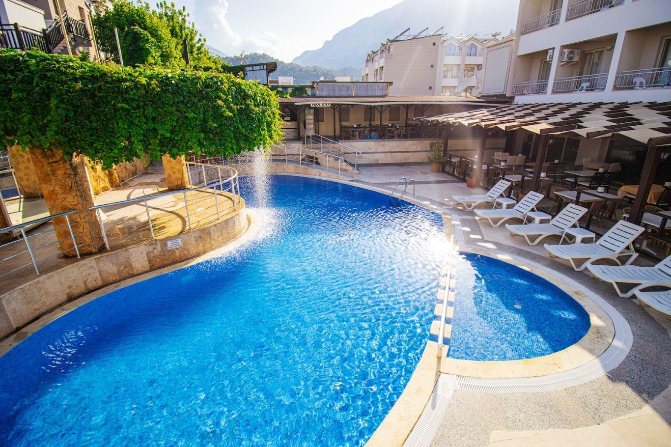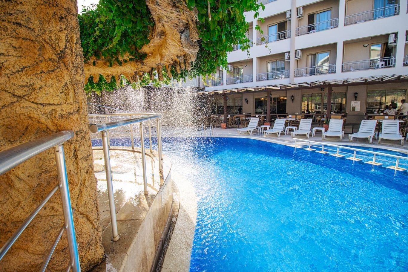 Всем привет! Отдыхала в этом отеле с мужем.Привезли нас в отель в 6 утра,заполнили документы и нас практически сразу заселили в номер.В Турции я отдыхаю в 4 раз. Прилетели мы из Самары, с нами ещё приехали 4 девчонок и 1 ребёнок самарские-всем приветик ;-)Начну рассказ про отель. В целом неплохой,скромная 4,номера чистые.Питание овощи,рис,супы,картошка,салаты,соя.За 9 дней 1 или 2 раза была курица.Было типо мясо-тушеное легкое вроде,мы так и не поняли.Из фруктов-апельсины,арбуз, дыня,зелёная кислая слива.Были яблоки,с грязью-плохо видимо мыли,приходилось перемывать.Напитки-чай,кофе.Голодными не оставались.Был бар с 11 до 23ч-пиво,водка,джин,вино красное,белое-невозможно пить,раки,спрайт,кола,фанта и типа соки, крашеная водичка из пакетов.До моря недалеко,минут 10 пешком через дорогу.Пляжные полотенца берите на рецепшене.Анимации в отеле нет и по всей видимости не будет.Включали музыку,до 23ч.Один и тот же диск каждый день.Молодежи приходилось самим себя развлекать.Отдельный привет Серёге из Питера-"руссиш анимэйшен"с его песней Бомба,всех веселил вытаскивал на танцы,заводила №1 в отеле,молодец.Серёга назвал этот отель-пансионат для престарелых.:-)) Также привет Диме,Свете из Белоруссии,Илье из Сыктывкара и всем остальным,кто помнит компашку из Самары. То есть кто хочет развлечений в Кемере есть ночные клубы:Аура, Инферно,Кристалл.Мы были в Кристалле,нам понравилось,можно потусить.Брали экскурсии не в отеле,цены завышены в 2 раза..В общем отдых удался, средний отель за небольшие деньги.Отдельным минусом хотелось бы отметить девушку Миргюль,которая работает на рецепшене-разговаривает сквозь зубы с людьми, вечно ничего не знает, просили её 2 раза нас на экскурсии разбудить, не разбудила нас.То есть вроде улыбается людям но всё так наигранно, фальшиво-неприятно,многим она не понравилась.Нельзя же так с людьми общаться,работать.Был ещё мальчик типа ди джей, не помню как зовут его,ходил улыбался, спрашивал как отдых в отеле. Просили поставить песни,забывал про нас. В общем руководству-подбирайте более адекватный, положительный персонал, чтобы могли нормально работать с отдыхающими, отзываться на их пожелания и просьбы.Понятно что мы для вас живой денежный конвеер-приехали-уехали,ну неприятно.А так на мой взгляд этот отель подходит для семейных пар, отдыха с детьми,молодежи если лететь с компанией будет весело.Сколько людей,столько и мнений,кто за чем едет на отдых...:-))