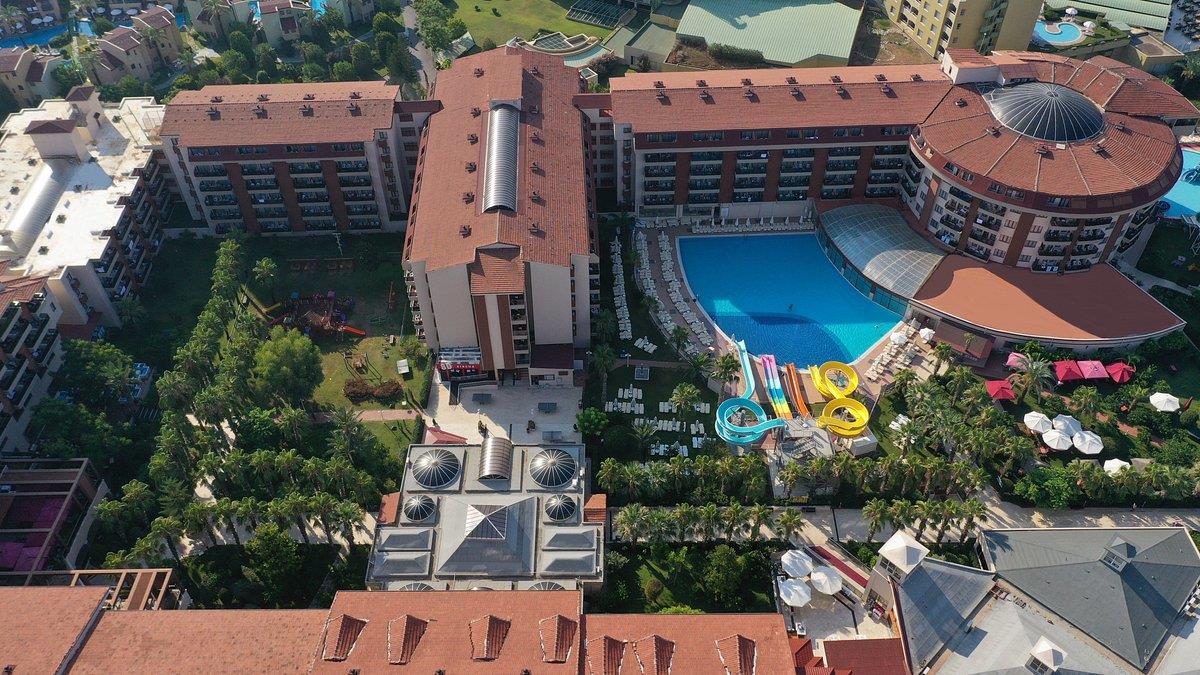 Точно не 5*. Хорошая тройка. Отношение персонала - легкое презрение и "мороз". Дав 20$ попросили хороший семейный номер (двухкомнатный), поселили подальше от дискотеки, но состояние просто мрак. Детский манеж на кровать (ребенку 4 года) поменяли после второго напоминания. Раковина в одном из двух санузлов была забита. На голову перед входом в номер капала вода из системы пожаротушения и стояло мокрое пятно на которое ни кто из персонала не обращал внимания. Все углы и двери затерты и неоднократно подмазаны, ремонтированы. Мебель разболтана, в ванной есть плесень по по швам плитки. Сантехника и душ убогие. Номеров для некурящих нет, запаха не было, но на балконах пластиковые стулья и стол оплавлены оставленными сигаретами. Рестораны не работали (только основная "столовка"), обещанного праздничного ужина не получили. Питание достойное, разнообразное, места всегда есть на улице. Еще одна проблема, даже не в сезон не хватает чистых чашек для чая. Приходится ждать по 15 минут, а принесенную работником порцию помытых расхватывают за 5, кто не успел - пей из одноразового. Уборка - отдельная история. Ежедневно оставляли 2$ - на качество не влияет. Под кровать не заглядывали, меняли наволочки на дырявые и полотенца на рваные. Лебедей не складывали, зато "профессионально" складывали бантик из пижамы жены, что её жутко бесило. С детским бассейном (или площадкой) действительно беда. Кроме нашего ребенка еще десятерых за неделю забрали в больницу с рвотой и поносом, ставили капельницу, надавали лекарств. Страховая попала по медицине. Эти же проблемы коснулись еще троих из нас в большей или меньшей степени. Зайти в море и выйти на пляж без специальной обуви просто не реально, если у вас пару лишних пальцев на ногах - попробуйте. Анимация была, но мы не участвовали, нам и так было весело. Так что же хорошее может уровнять изложенное? Позитивный настрой, неприхотливость, дружная семья, неподдельная радость детей и понимание того, что на родине сейчас ноль градусов, а у тебя возле бассейна +24. Советовать этот отель не станем, сами точно второй раз сюда не приедем.