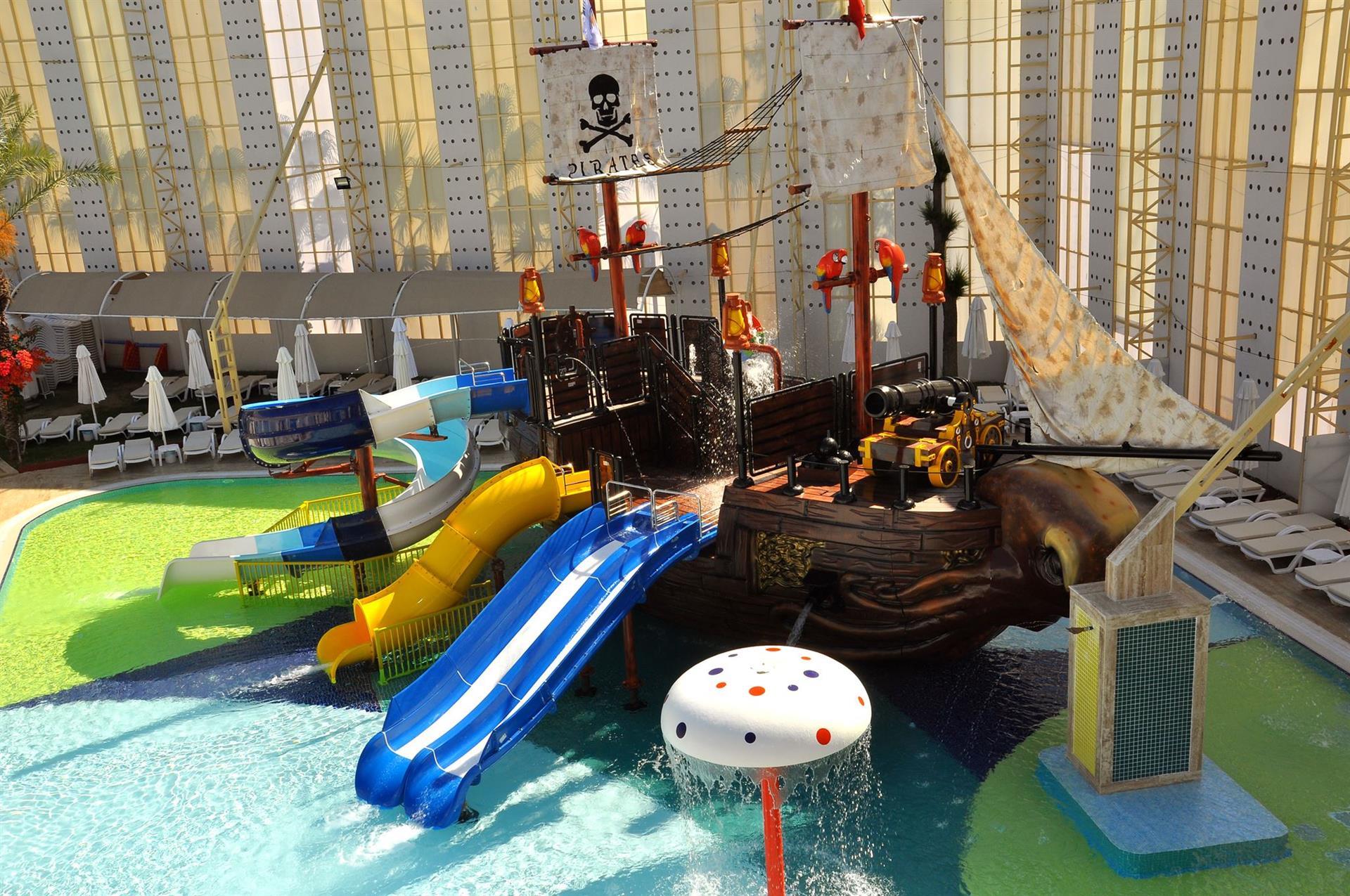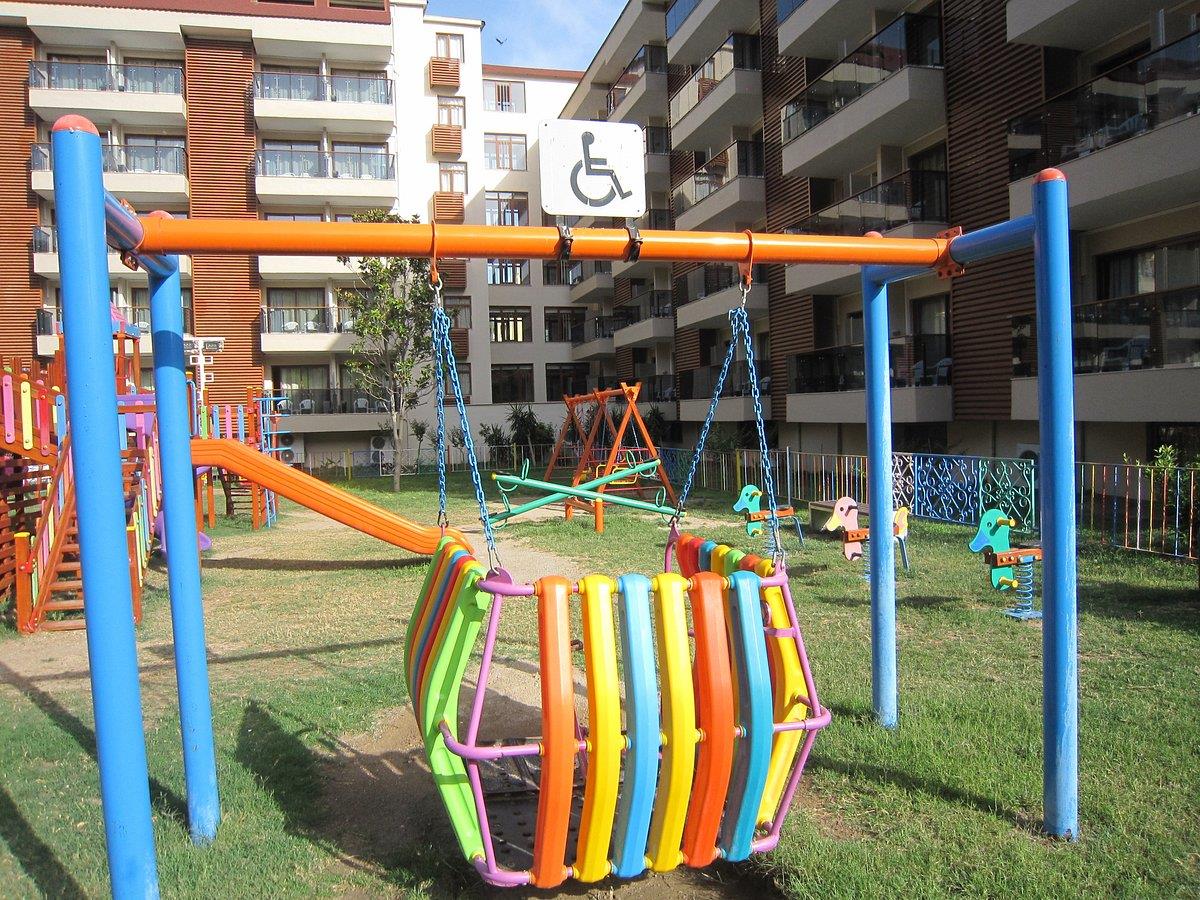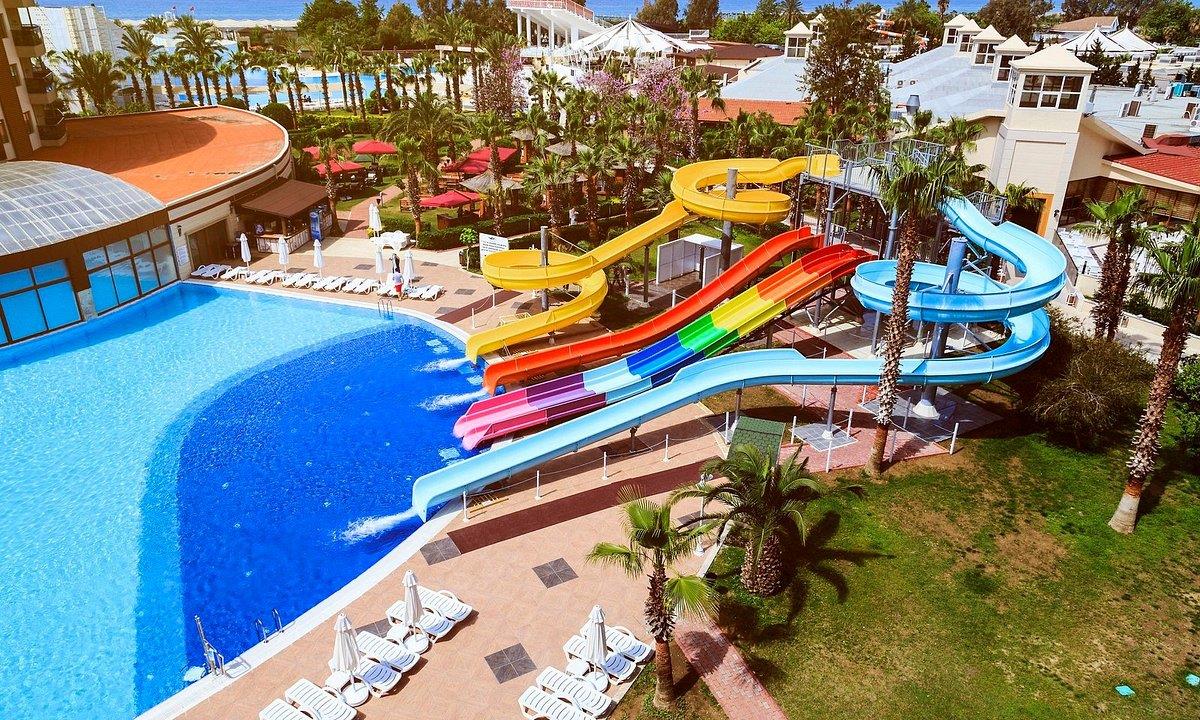 Территория отеля на "дохлую" четверку. Грязи нет и это уже не плохо. Вечером освещенность плохая. В Турции видать лампочки в дефиците. Воду возле бассейна не убирают. Народ с большим азартом и визгом испытывают пятую точку на прочность. В отеле имеется комплекс водных горок которые на обед отключают. Так же имеется детский бассейн с горкой. Пляж каменный, но чистый. Во время отдыха вам ненавязчиво будут предлогать водные аттракционы, поездку в кожный центр и кукурузу за 1$. На пляже имеется пирс с которого прыгать запрещёно, но каждое утро местная охрана снимает ограждение ;).