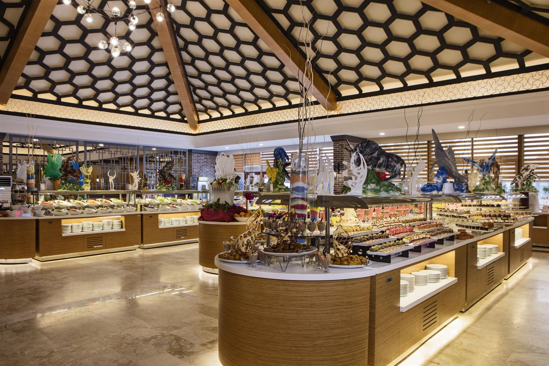 Очень советую турецкий чай, который стоит на специальных стендах (посередине ресторана красивая хренотушка с четырьмя краниками). Кофе и соки из автоматов, пепси с фантой и спиртное разливают два веселых бармена на баре в конце ресторана. Никаких очередей не видел (ну если не считать три-четыре человека за горячим). Никто через голову не лез и горячее на меня не ронял (не повезло). Народу много, поэтому Ты можешь сесть чуть ближе или чуть дальше, но сядешь всегда. Официант расторопны и вежливы, мелкие косяки бывают, но, если не морочиться, эмоции сугубо положительные. Ресторан в форме штанов (в отличие от пифагоровых ни фига не равных). Единственное неудобство – бар в конце левой штанины, поэтому если сел в правой (где мы в-основном и обитали) – до бара топать метров пятьдесят. Печалька, особенно когда детям надо три раза лимонад принести. Ну и конечно периодические попытки разлива лимонада в пластиковые стаканчики огорчали, хотя, если предварить заказ вежливой просьбой – в стекло – мне ни разу не отказали.