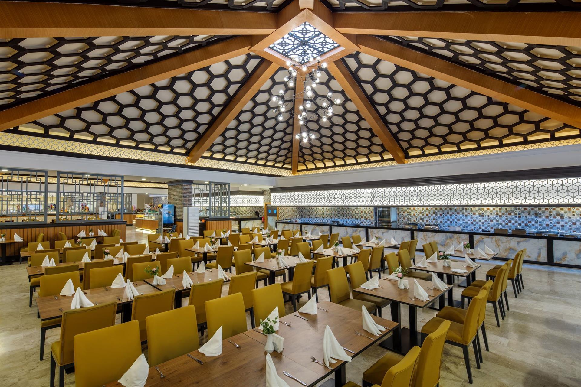 В отеле имеется 2 ресторана. Один ресторан общий и довольно большой. Он поделен на 2 части. Крытая уличная часть и закрытый. Правда в дождь и он протекает :). Второй À la carte. Он платный. Цена вопроса 5€ и запись до 12 дня. Еды много. Выбор есть и она почти однообразная. Есть такие мясные блюда как шашлыки, шаурма или как ее там, курица и рыба. Множество всяких рулетов. Есть овощи и фрукты. Макароны и каши. Сладкое и горькое. Если сказать проще, то с питанием проблем вообще не было. Правда ни соков ни колы со спрайтом и фантой не было. Была бодяга которая это все заменяла. Но люди это благополучно употребляли.