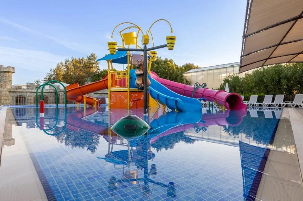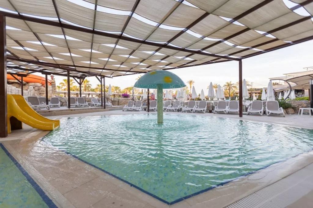 Кстати немцы, почему-то предпочитают бассейн морю. Поэтому у бассейна все шезлонги всегда заняты, а вот на море свободный всегда найдешь. Полотенце меняют каждый день, по персональной карте, которую тебе дают на ресепшене. Меняют в не удобное время до 2-х дня. Но меня это не обламывало. Я его меняла когда шла на пляж, а не когда уходила. Все бассейны (а их там 2 открытых, один закрытый и один детский) моют и хлорируют. Так что, нет опасности, заразиться. Есть две аква горки, которые работают до 19.00.