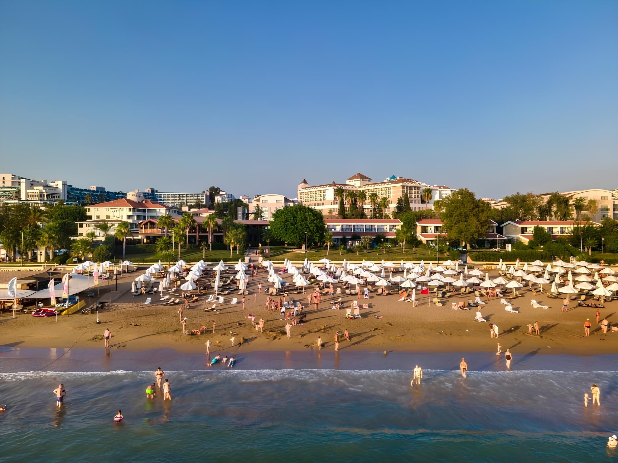 Пляж большой.Лежаков и зонтиков хватает.Чисто.Вход в море удобный.Питание,как я уже говорила, разнообразное и вкусное.Можно пообедать в основном ресторане или в бич-баре.Есть несколко ресторанов а ля-карта.В них записываешься самостоятельно,через компьютер на ресепшн.Огромный минус отеля - очень много народу.Поэтому столик найти иногда-проблема,несмотря на огромное количество залов и террас в ресторане.Отдыхают в основном русские и немцы,встречаются и турки.Предпочтение официанты оказывают немцам и к этому надо быть готовым.Только им моментально приносят приборы и выпивку,а вам придется побегать за официантом,чтобы обратить его внимание на себя.