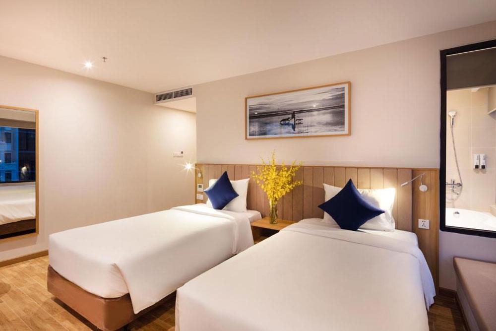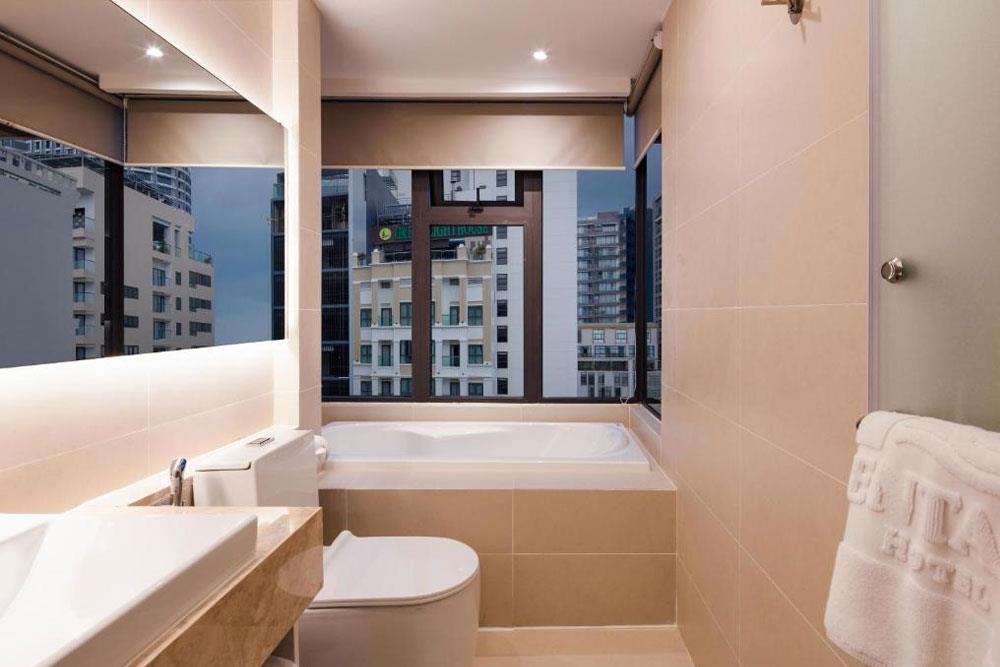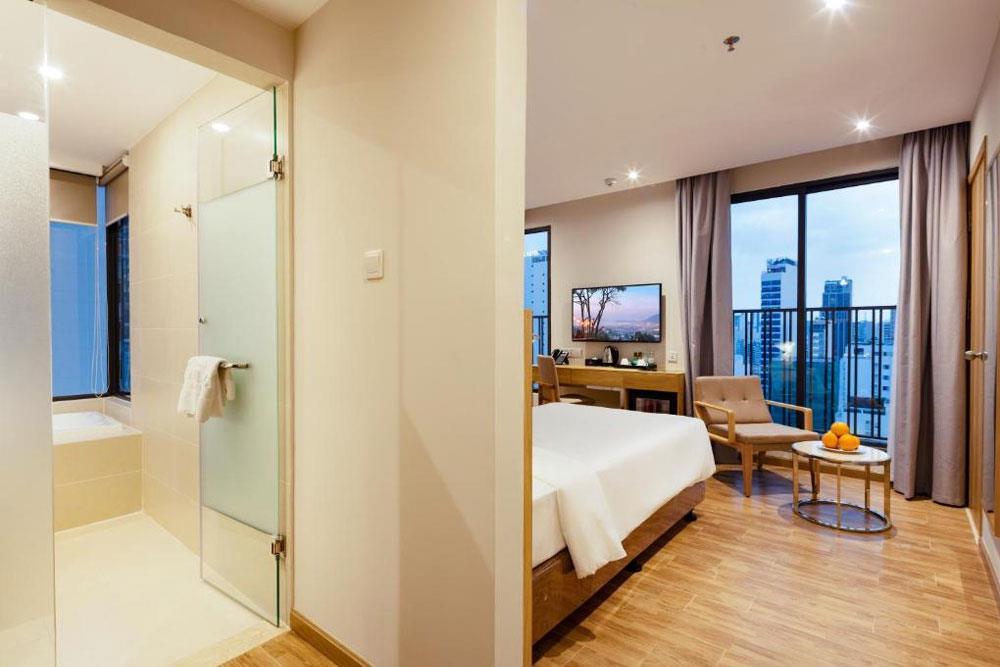 В тот момент, когда мы вошли в нашу комнату, мы были просто поражены просторной и хорошо обставленной комнатой. В нашей комнате были большие окна с видом на красивый прибрежный город Нячанг. Ванные комнаты полностью оборудованы и просторны. К нашему удивлению, в ванной была ванна. Кроме того, отель верит в спасение планеты, и мы не нашли одноразовых пластиковых бутылок для туалетных принадлежностей. Ванные комнаты оборудованы дозаторами для мыла и шампуня.